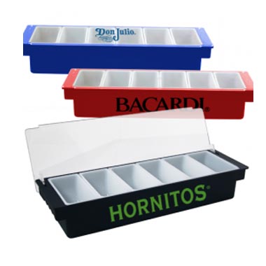 Our 6 pint condiment holder, also referred to as a Garnish Center, has a smooth flat plastic lid. This is helpful when it comes time to store fruit and garnishes in a cooler or refrigerator because other things can be stacked on top of it. If you combine this preservation of storage space with its molded handles, closing lid, and 6 removable one pint containers, it becomes one very effective device that is filled, cleaned, and stored with ease.