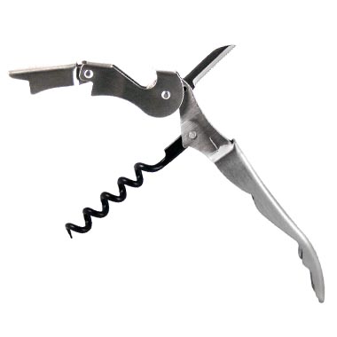 This corkscrew comes equipped with a double lever boot system, a stainless steel serrated knife and a Teflon coated spiral. The handle is black ABS. A necessary tool for most bartenders and all sommeliers, this corkscrew measures 4 and 3/4" when closed so it will fit nicely into a pocket or apron.